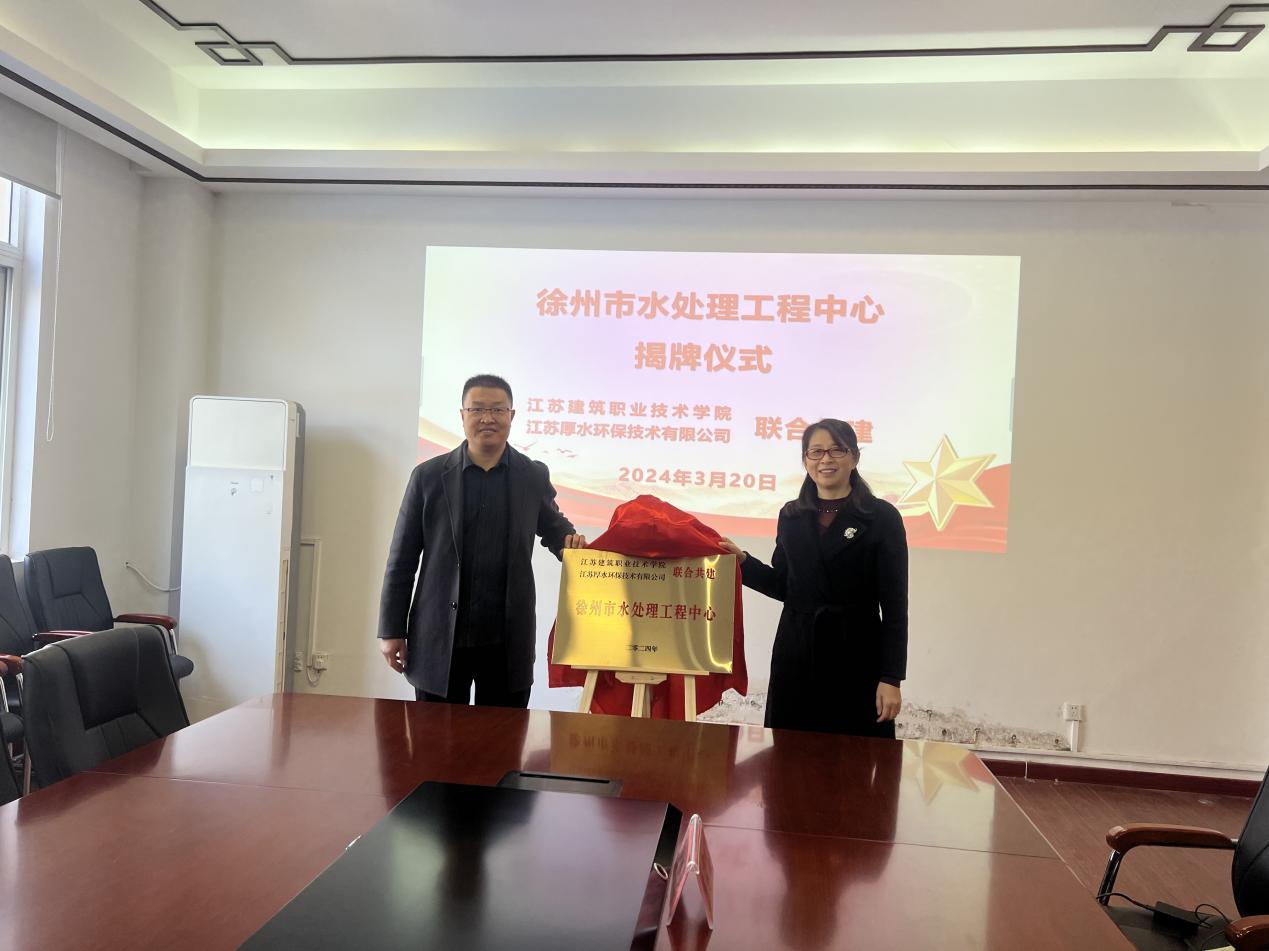 最后,学院党总支书记张侠与袁艳伍共同为双方联合共建的徐州市水处理工程中心揭牌。