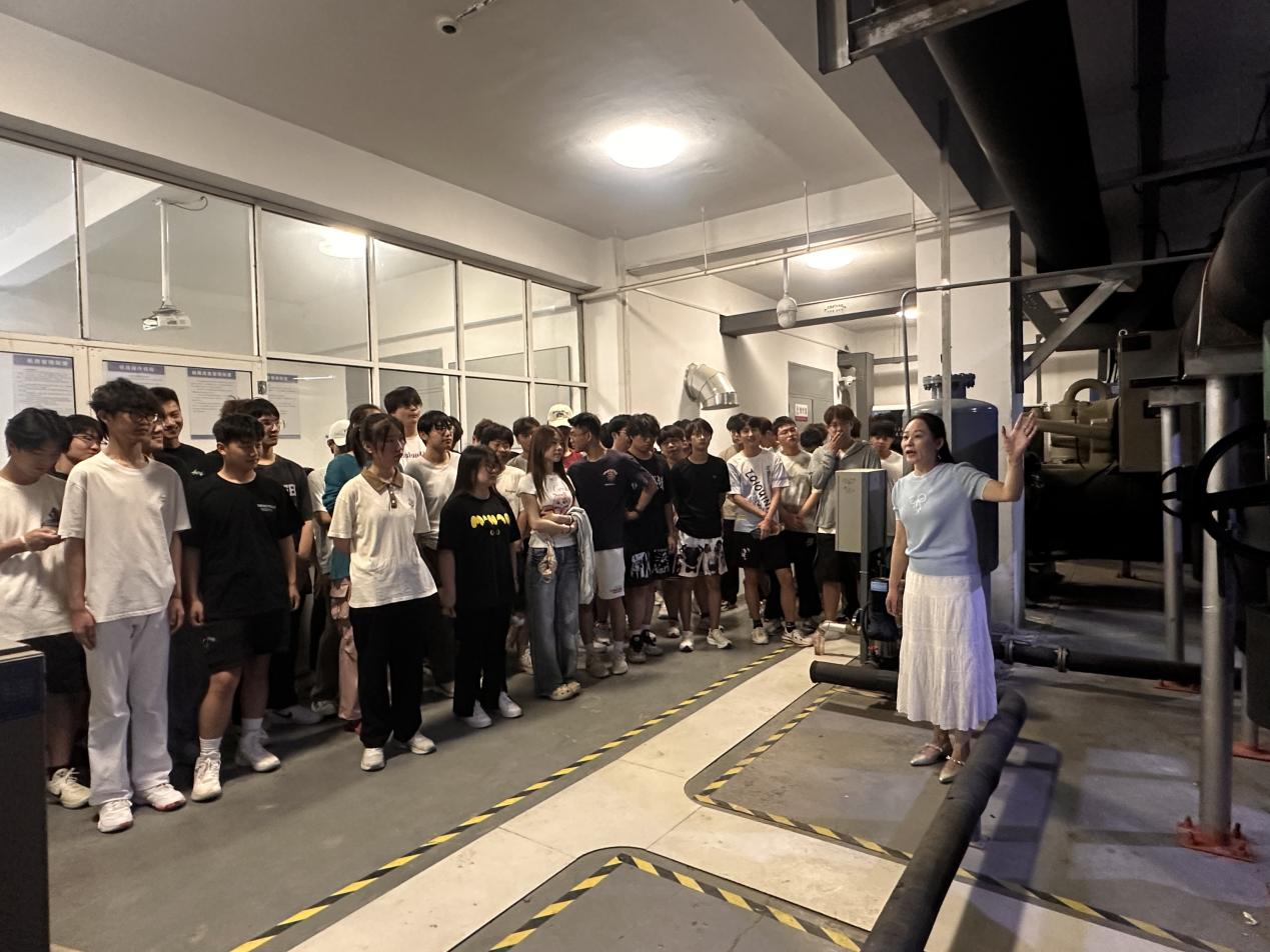 在鲜红党旗下,党支部书记张静率先作动员讲话,勉励新生珍惜实践机遇、勤思善问,深悟专业魅力。随后全体新生分组进入项目现场,在支部推行的三重导师协同育人机制中进行沉浸学习。江苏合创资深工程师张祥松作为企业导师,深入浅出地介绍了系统的整体构成、工作原理,特别是地源热泵与空气源热泵如何“多源互补”、协同工作。新生明梦惊叹:好神奇,原来土壤里的能量也能为我们供冷供暖啊”。教工党员高喜玲副教授作为“专业导师”,结合专业课程理论,现场生动讲解如何从土壤、空气中获取能量等地源、空气源热泵的工作原理,为学生搭建起理论通向实践的桥梁。党支部副书记吕艳作为思政导师”通过节能改造项目的鲜活案例剖析,一笔笔算清绿色账”,在学生们心中深植绿色发展核心理念。