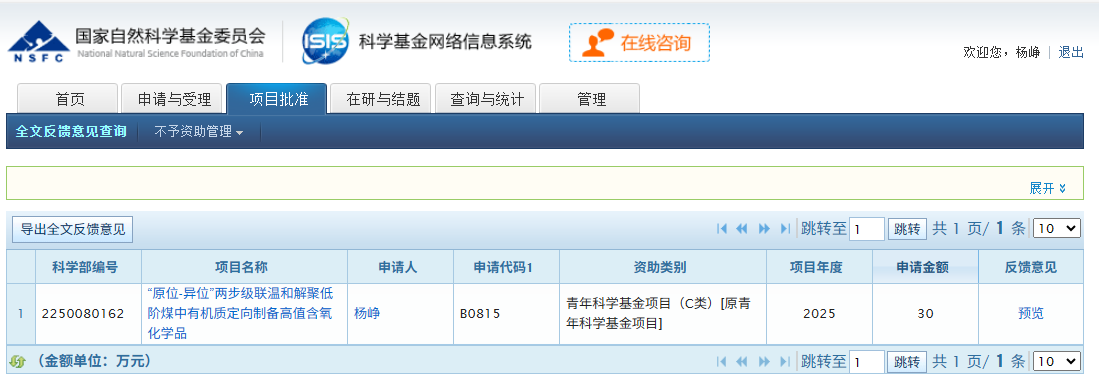 8月27日,国家自然科学基金委公布2025年度评审结果,学院杨峥博士申请的《“原位-异位”两步级联温和解聚低阶煤中有机质定向制备高值含氧化学品》项目,成功获批国家自然科学基金青年科学基金项目立项资助(项目批准号:22508147;资助经费30万元)。
